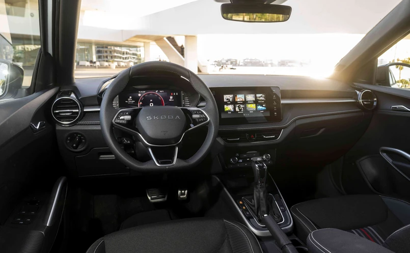 Wewnątrz Skoda stawia na materiały wyższej jakości – czuć i widać tu troskę o detale. Tam, gdzie konkurencja skąpi, Czesi stosują lepsze tworzywa. Przednie sportowe fotele ze zintegrowanymi zagłówkami, podparciem bocznym i elektryczną regulacją zapewniają niezłe trzymanie. Zamiast klasycznych zegarów, za trójramienną, perforowaną kierownicą mamy 10-calowy wirtualny kokpit. Ekran stacji multimedialnej ma 8 cali. Do tego stalowe nakładki na pedały, czarne aluminiowe listwy progowe oraz srebrne wstawki dekoracyjne na desce rozdzielczej i klamkach.