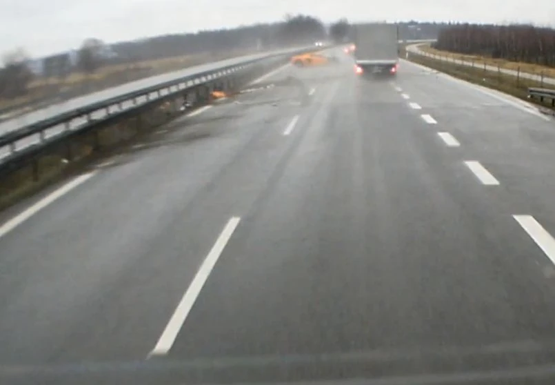 Na wideo zamieszczonym w sieci widać, jak pomarańczowy McLaren 650S, na niemieckich tablicach rejestracyjnych, wpada w poślizg na mokrej nawierzchni i roztrzaskuje się o barierki.