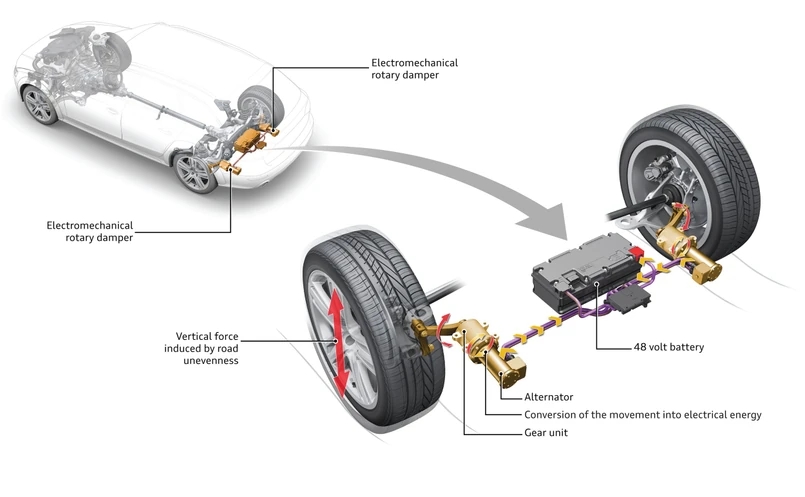 Inżynierowie Audi w rozwiązaniu o nazwie eROT tradycyjne amortyzatory hydrauliczne zastąpili elementami elektromechanicznymi (ramię z silnikiem elektrycznym). W trakcie jazdy system zamienia energię kinetyczną z ruchu zawieszenia (w górę i w dół) w energię elektryczną magazynowaną w akumulatorze litowo-jonowym.
