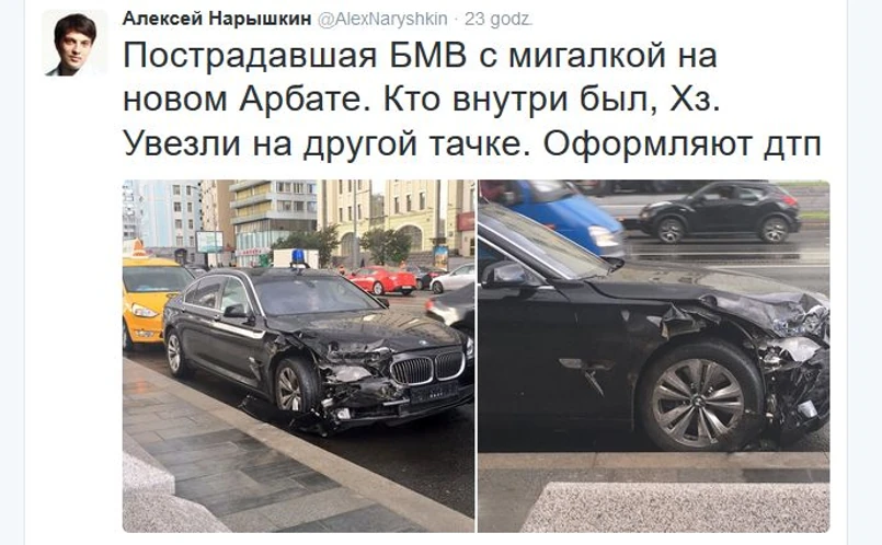 Samochód z kremlowskiej administracji zderzył się z taksówką na Nowym Arbacie, jednej z głównych ulic w centrum Moskwy. Serwis gazeta.ru podaje, że BMW pędziło z włączoną sygnalizacją auta uprzywilejowanego. Drogę państwowej limuzynie zajechać miał taksówkarz zawracający swoje auto w niedozwolonym miejscu (przeciął dwie linie ciągłe).
