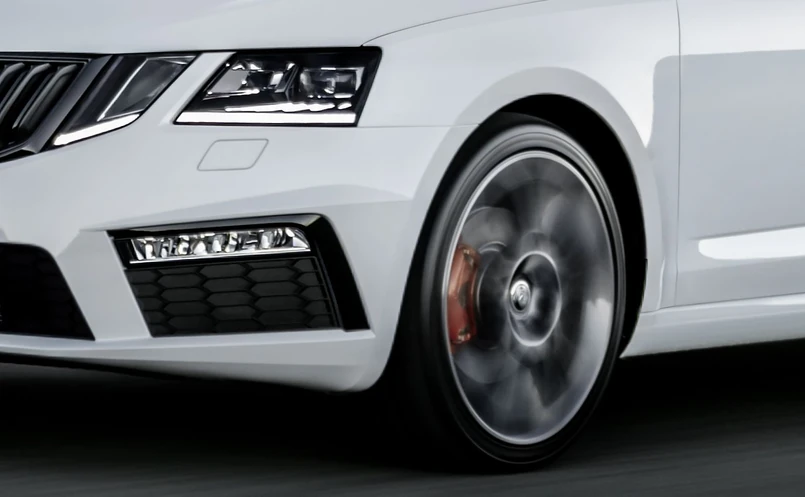 Skoda octavia RS w nowym wcieleniu także dostała podwójne reflektory à la mercedes klasy E. Samochód wyposażono w cztery przednie lampy wykonane w pełni w technologii LED z funkcją adaptacyjnych świateł AFS. Nowa twarz to także szersza osłona chłodnicy i zmieniony zderzak z powiększonymi wlotami powietrza przykrytymi kratownicą o strukturze plastra miodu.