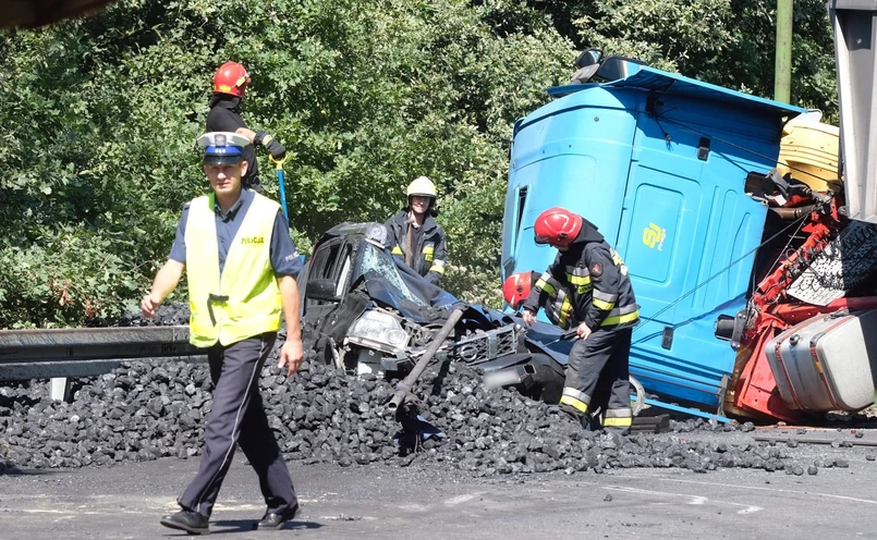 Do wypadku doszło we wtorek po południu na ul. Beskidzkiej w Tychach, przy zjeździe na ul. Tadeusza Boya-Żeleńskiego. Na łuku drogi przewożąca węgiel scania przewróciła się na nissana, którym podróżowały trzy osoby. 68-latkowi oraz 85-latce z pomocą strażaków udało się opuścić przysypany pojazd. 57-letnia kierująca autem poniosła śmierć. Aby ją uwolnić, trzeba było m.in. postawić przewróconą 30-tonową ciężarówkę i usunąć zwały węgla, a następnie wyciąć fragment zmiażdżonego auta. Kierowca ciężarówki był trzeźwy.