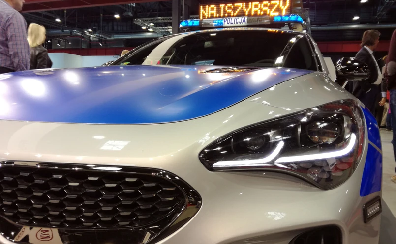 Kia Stinger w policyjnym oznakowaniu w najmocniejszej wersji GT z silnikiem 3.3 V6 T-GDI/370 KM i seryjnym napędem 4x4 to największa sensacja X edycji Ogólnopolskich Targów Motoryzacyjnych i Biznesowych - Fleet Market 2018 zorganizowanych w Warszawie w halach byłej Fabryki Samochodów Osobowych.