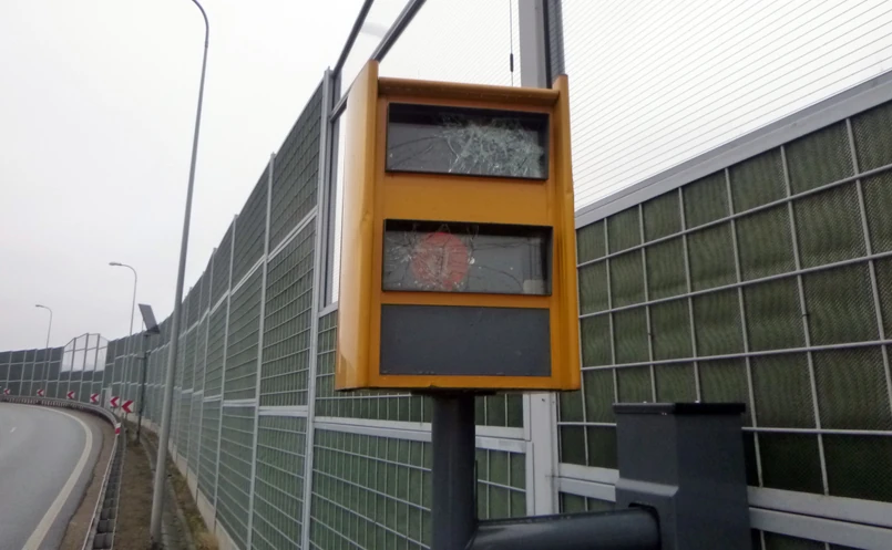 Uszkodzone ściany obudowy, rozbita szyba pancerna wizjera kamery i lampy błyskowej, zepsuta głowica – to bilans uszkodzeń fotoradaru na węźle drogowym Gliwice "Sośnica", przy zjeździe z autostrady A1 na A4.