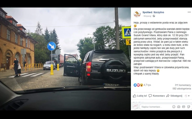 – Dla przeciwwagi (...) będzie coś pozytywnego. Pozdrawiam Pana z ciemnego Suzuki Grand Vitara, który dziś ok. 12:30 przy ZS1 zatrzymał samochód, żeby przeprowadzić starszą panią przez ulicę. Widać że pani już w takim wieku że ledwo stała na nogach, u boku dwie kule, a kto jeździ tamtędy często ten wie jak duży jest ruch samochodów i mimo przejścia dla pieszych z wysepką ciężko jest się wbić żeby przejść. Pan spokojnie zatrzymał auto, przeprowadził Panią, przeprosił czekających kierowców i odjechał. Nikt nie zatrąbił. Więc pozdrawiam! Wiara w człowieka przywrócona, dzień od razu lepszy :) chłopak z szarej Mazdy – zakończył relację.