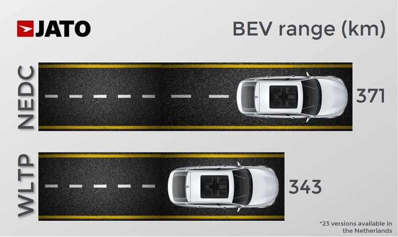 Pierwsza rzecz, na jaką zwrócili eksperci Jato to pojemność baterii, która przy przeskoczeniu z NEDC na WLTP - wzrosła o ponad 10 proc. O ile w pierwszym wypadku średnia dla 23 porównywanych modeli wynosiła 48 kWh, to po zmianach wzrosła do 54 kWh.