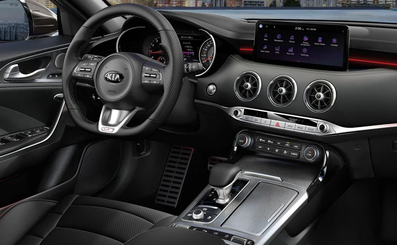 W kabinie Kia obiecuje jakość na wyższym poziomie. Dolna część kierownicy Stingera ma nowe, metaliczne wykończenie, które nawiązuje do chromowanej ramki otaczającej zestaw wskaźników. Bezbramkowe lusterko wsteczne to powiew rozwiązań z stosowanych w autach premium. W zależności od wyposażenia, deska rozdzielcza i drzwi mają kontrastowe szwy. Konsola środkowa może być wykończona aluminium lub materiałem przypominającym włókno węglowe. Nowe nastrojowe oświetlenie kabiny oferuje do wyboru aż 64 kolory.