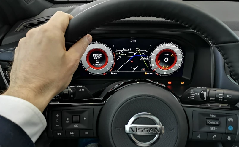 W kabinie wirtualny kokpit z ekranem o przekątnej 12,3-cala, który można konfigurować na szereg sposobów. Ukłonem w kierunku japońskiego rodowodu Nissana jest cyfrowe tło o tradycyjnej fakturze kryształowego szkła Kiriko (tradycyjna sztuka zdobienia szkła pochodząca z końca okresu Edo). Do tego jeszcze 10,8-calowy wyświetlacz head-up, który w ocenie inżynierów zapewnia największy w tym segmencie rozmiar obrazu. Na linii wzroku kierowcy na przedniej szybie wyświetlane są kluczowe informacje nawigacyjne, wspomagające prowadzenie oraz drogowe. W honorowym miejscu, na środku kokpitu umieszczono 9-calowy ekran systemu NissanConnect. To centrum sterowania wszelkimi multimediami z Android Auto i Apple CarPlay (bezprzewodowo). System kamer 360° ułatwi manewrowanie. Podróżujący mają dostęp do umieszczonych z przodu i z tyłu gniazd ładowania USB-A oraz USB-C i bezprzewodowej ładowarki o mocy 15 W. Komfort to także dwustrefowa klimatyzacja, podgrzewane fotele oraz panoramiczny dach.