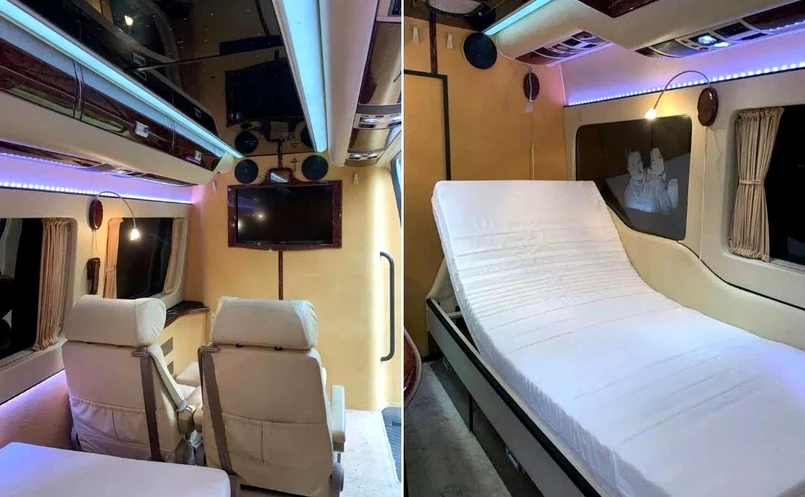 Wnętrze przypomina bardziej apartament niż typowego kampera. Kąt pochylenia materaca w łóżku można regulować elektrycznie. Fotele ze skórzaną tapicerką są obrotowe i przesuwane. Do tego jest barek, garderoba z lustrem czy najróżniejszego kalibru schowki. Jedną z szyb zdobią wizerunki Krawczyka i jego żony, a sufit napis "Krzysztof i Ewa".