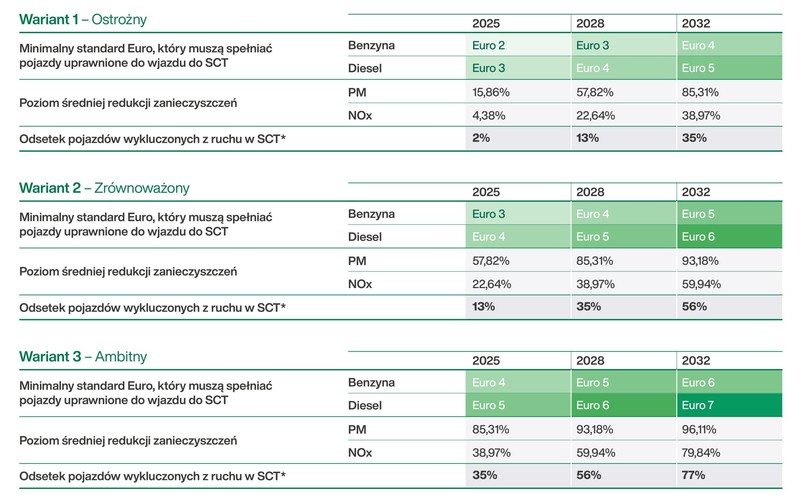 Rekomendacje ekspertów przewidują trzy zakresy ograniczeń, jeśli chodzi o zakazane samochody. Pierwszy wariant, nazwany ostrożnym, ustawia poprzeczkę na poziomie 30 lat (norma emisji spalin Euro 2) dla samochodów benzynowych oraz 25 lat (Euro 3) dla diesli.