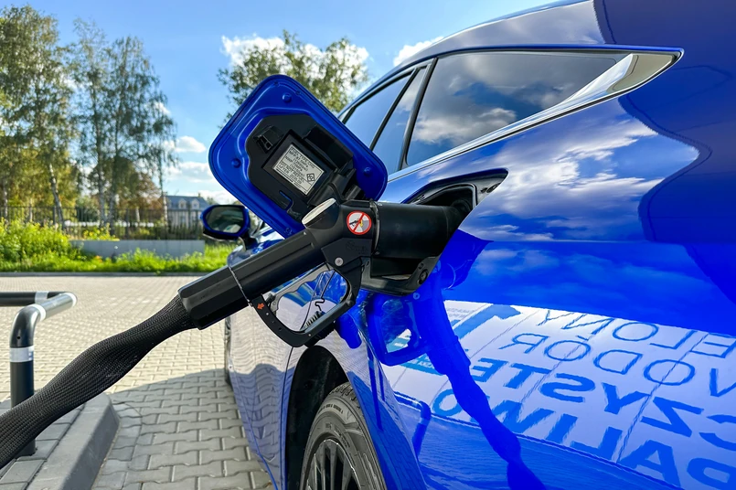 Podjeżdżamy pod dystrybutor - na stacji Neso są dwa. Jeden z nich służy do tankowania autobusów i ciężarówek. Ten dla aut osobowych jest niskociśnieniowy i właśnie do niego podłączamy Toyotę Mirai. To był falstart - okazuje się, że tankowanie należy poprzedzić płatnością. Tym razem wczytujemy się w instrukcję i czeka nas miłe zaskoczenie. Wraz z Toyotą Mirai odebraliśmy kartę flotową do tankowania, ale na wodorowej stacji możemy zapłacić blikiem lub dowolną kartą płatniczą. To zaleta względem stacji ładowania aut elektrycznych, które najczęściej wymagają konta, aplikacji lub zamówionej wcześniej karty zbliżeniowej. Mała rzecz, a cieszy. Po uiszczeniu opłaty podpinamy pistolet, który należy zacisnąć w gnieździe ładowania, a następnie wciskamy zielony przycisk. I czekamy, bo tankowanie trwa kilka minut - w tym czasie kobiecy głos dobiegający z urządzenia tłumaczy, że uzupełnianie paliwa jest przerywane i potrwa parę chwil. Po zakończeniu tankowania paliwa jesteśmy proszeni o odłożenie pistoletu na miejsce, a cały proces wieńczą podziękowania za jazdę autem wodorowym.