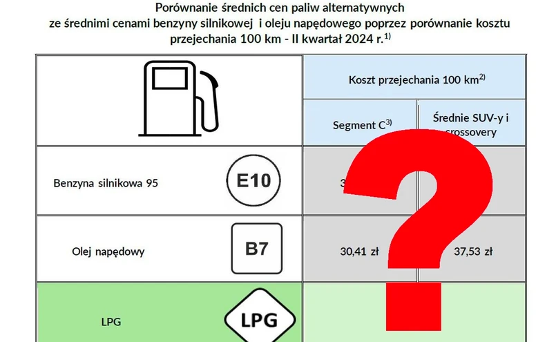 Gaz LPG jest paliwem, na którym najtaniej można przejechać 100 km. Koszt przejechania 100 km wynosi 22,12 zł – wyliczają analitycy ministerstwa. Samochód kompaktowy z silnikiem Diesla na tym dystansie zużyje oleju napędowego za 30,41 zł (SUV i crossover – 37,53 zł). Podium zamyka auto z silnikiem benzynowym – przejechanie 100 km na benzynie 95 ma kosztować 36,37 zł (SUV – 47 zł).