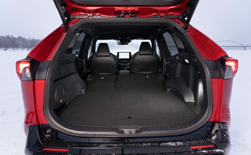 Bagażnik zapewnia 580 litrów regularnie ukształtowanej przestrzeni. Pojemność można powiększyć przez złożenie tylnych siedzeń do 1690 l. Kufer wersji plug-in jest mniejszy – 520/1160 l. W zależności od napędu RAV4 potrafi holować przyczepę o masie do 2 ton.