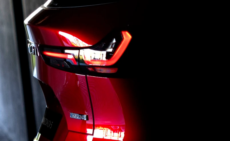 Nowa Mazda CX-5 w kolorze Soul Red Crystal z długą kabiną, dachem lekko opadającym w stylu coupe i niżej poprowadzoną maską silnika wygląda fenomenalnie. Japoński producent na pierwszych zdjęciach pochwalił się sylwetką swojego najnowszego dzieła. Pod względem proporcji przypomina większe modele CX-60 i CX-80. Drapieżności dodają nowe reflektory Matrix LED z podwójną sygnaturą świateł dziennych.