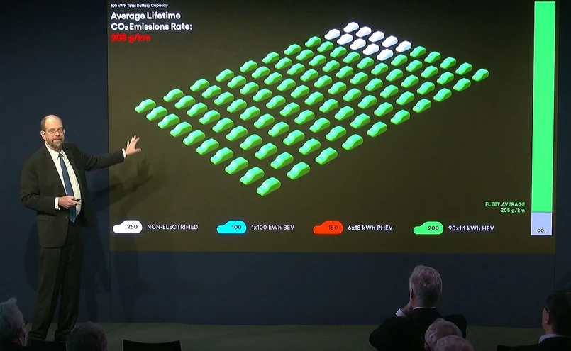 – Musimy zrobić to, co najlepsze dla środowiska, czyli dopilnować, aby każde ogniwo baterii zainstalowane w samochodzie przełożyło się na największą możliwą redukcję emisji CO2. Dlatego trzeba jak najwięcej aut spalinowych zastąpić zelektryfikowanymi pojazdami. Kierujemy się prostą zasadą, że naszym przeciwnikiem jest dwutlenek węgla, a nie taki czy inny napęd – mówi Pratt i zauważa, że bateryjne samochody elektryczne poruszają się wyłącznie na prądzie, ale pochłaniają bardzo dużo litu. Tu naukowiec pokazuje wyliczania i porównanie trzech sposobów obniżenia emisyjności floty 100 samochodów spalinowych przy użyciu tej samej liczby ogniw bateryjnych o łącznej pojemności 100 kWh.