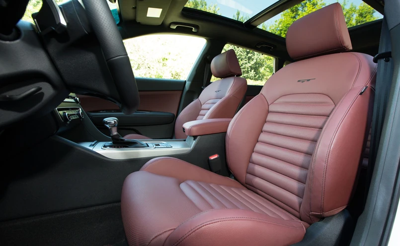 6 Na pokładzie bogactwo - skórzana tapicerka to standard. Multimedialny system z ekranem dotykowym seryjnie współpracuje z mocnym, 590-watowym sprzętem audio Harman Kardon Premium Sound wyposażonym w 10 głośników w optimie GT w wersji sedan i 490-watową wersją tego systemu z 8 głośnikami w kombi. W skład obydwu systemów audio wchodzą zewnętrzny wzmacniacz i subwoofer. Optima GT może być wyposażona w bezprzewodową ładowarkę o mocy 5W - wystarczy położyć smartfon we wnękę na tunelu przy konsoli środkowej.