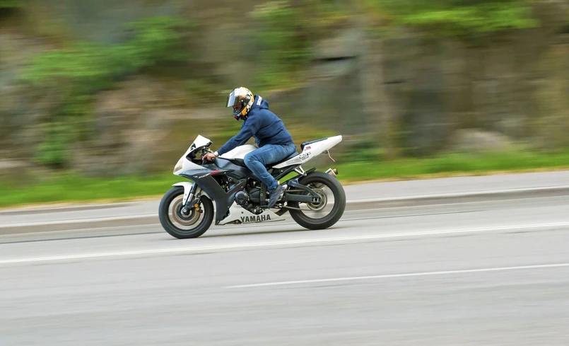 Na ruchliwej drodze w Warszawie kamera Polsat News zarejestrowała kierowcę motocykla, który wiózł kilkuletniego pasażera. Dziecko jechało z przodu. Oboje mieli na głowie kaski, ale nie mieli specjalnych ubrań.