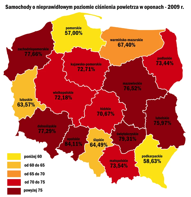 Województwa o najgorszym stanie ciśnienia w oponach to opolskie i świętokrzyskie, gdzie na nieprawidłowym ciśnieniu poruszało się odpowiednio 84 i 79 proc. przebadanych aut - tak wynika z najnowszego raportu opracowanego przez Michelin i Statoil. Bardziej świadomi znaczenia dobrego poziomu ciśnienia w kołach okazali się kierowcy z województwa pomorskiego - tam aż 43 proc. samochodów jeździ na prawidłowym ciśnieniu.