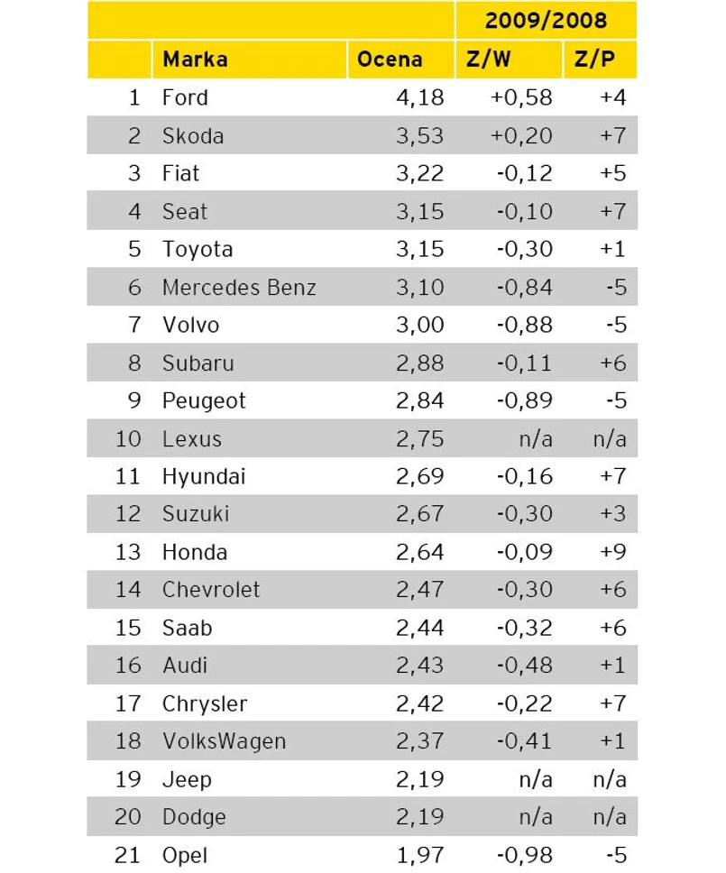 Spośród 21 sklasyfikowanych w badaniu marek, najwyższą zbiorczą ocenę satysfakcji otrzymał Ford. Z wynikiem 4,14 awansował z zajmowanej w 2009 r. 3 pozycji i jako jedyny uzyskał więcej niż 4. "Osiągnięty wynik bardzo nas cieszy, ale i motywuje do dalszej pracy, ponieważ w naszej ocenie jakość współpracy importera z dilerami przekłada się bezpośrednio na jakość obsługi klientów w autoryzowanych salonach sprzedaży" - powiedział dziennikowi.pl Bogusław Głód, dyrektor sprzedaży i marketingu Ford Polska.