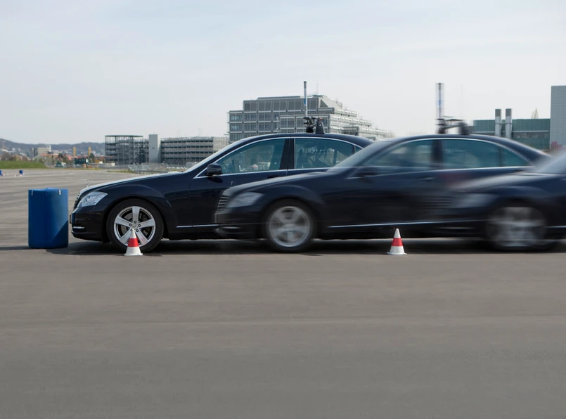 Stuttgart, kwatera główna Mercedesa. Na plamie placu testowego leniwie grzeją się w słońcu dwie czarne limuzyny - klasa S i klasa E. Pada rozkaz - jazda! Auta nabierają prędkości i pędzą precyzyjnie, momentami przypomina to taniec, kiedy w slalomie wyprzedzają się nawzajem a nawet zajeżdżają drogę. Próby są powtarzane kilkukrotnie, za każdym razem samochody mkną dokładnie po tym samym śladzie (opony zdążyły już zaznaczyć ciemniejsze pasy), w tym samym rytmie, w identycznej kombinacji… Sytuacja na skrzyżowaniu, gdzie przecinają się tory jazdy mrozi krew w żyłach, zwłaszcza widok z kabiny (najlepiej widać to na filmie). Człowiek zamknąłby oczy i uciekł…