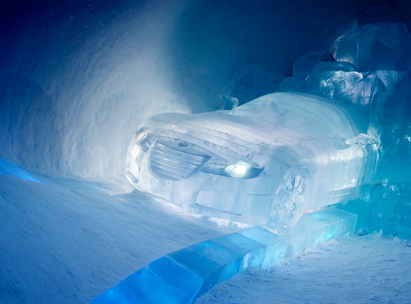 200 kilometrów od bieguna północnego jest niezwykły, bo lodowy hotel ze specjalnym pokojem, a w nim wyrzeźbiony prototyp saab aero X. Samochód z krystalicznej zmarzliny wykuła Tjasa Gusfors (projektantka w Icehotel, specjalizuje się w lodowych i śnieżnych rzeźbach). Simon Padin, szef stylistów Saaba pilnował, by wszystko było OK.