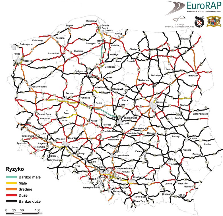 - "czarne i czerwone odcinki" (tj. odcinki o ryzyku niedopuszczalnym na podstawowej sieci dróg europejskich) stanowiły 84 proc. długości analizowanych dróg (w tym: 91 proc. dróg krajowych i 79 proc. dróg wojewódzkich),