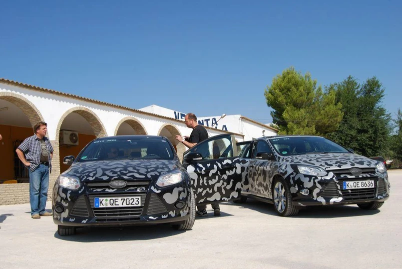 Zamaskowane blachy na czterech kołach to najnowsza generacja focusa. Zdjęcia przedstawiają dwa prototypy w 40 stopniowym hiszpańskim upale - pięciodrzwiowy hatchback to model przeznaczony na rynki europejskie, zaś stojący obok sedan to auto, które trafi do USA.