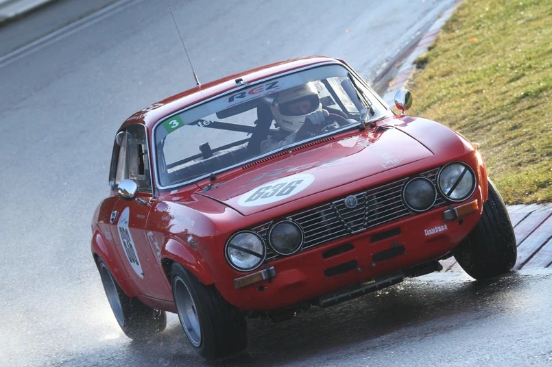 "Warunki do jazdy były bardzo trudne: słońce świecące na wprost, mokry tor na wewnętrznych stronach zakrętów oraz tralki. Niestety - wyścig zakończyłem walcząc o 2 miejsce z Porsche 914-6. Raczej staram unikać się wchodzenia "bokiem" auta i robienia sobie miejsca na torze... Niestety - w tym wyścigu była to zła strategia. Przez 2 okrążenia byłem skutecznie blokowany na zakrętach. Moja Alfa - cięższa i słabsza - nie ma szans na prostej, dlatego starałem się wyprzedzić Lapawę na krętej części toru. Za mną podróżowało MGB oraz Ford. Właśnie w momencie próby przejścia 914, która wyraźnie zwolniła i zrobiła mi miejsce, postanowiłem pojechać po mokrej części toru. Zakręt i podjazd pod wzniesienie wymusił redukcję z 5 na 3 i wtedy Lapawa w 914 zorientował się, że jest wyprzedzany i zamknął mi drogę. Chcąc uniknąć kolizji skręciłem w prawo - to wystarczyło, by przyblokować przednie koło o wysoki i do tego bardzo śliski próg i spowodować poślizg" - relacjonuje walkę Rafał Płatek.