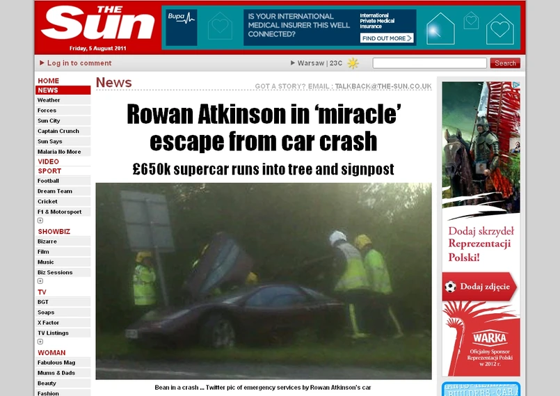Pech dopadł komika w czwartek wieczorem (4 sierpnia 2011) na drodze A605 w Haddon nieopodal Peterborough. Atkinson sam miał wysiąść z roztrzaskanego McLarena cierpliwie czekać na przyjazd pogotowia. Straż pożarna ugasiła płonącą supermaszynę aktora.