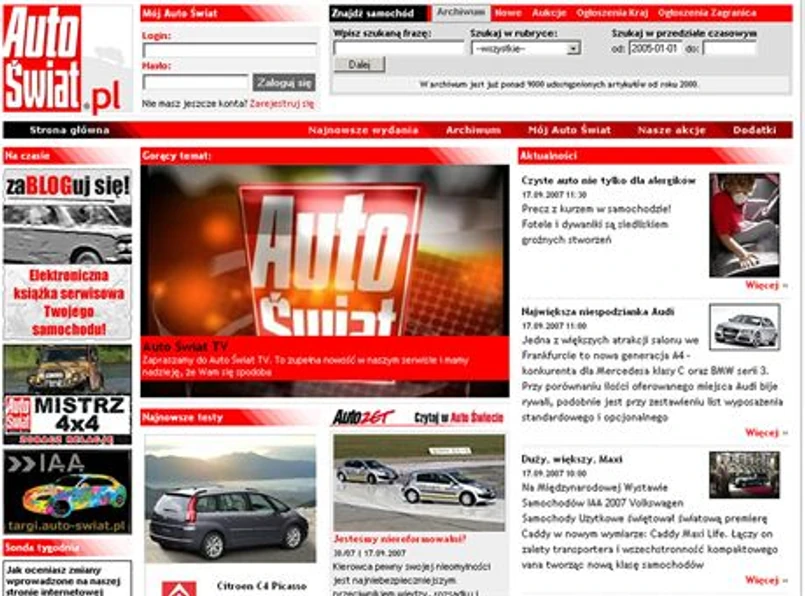 Jednak kanał telewizyjny to nie wszystko. Odmłodzona witryna www.auto-swiat.pl jest bogatym archiwum artykułów (profesjonalne testy, bogate prezentacje samochodów używanych, porady, leksykon pojęć motoryzacyjnych) i odpowiedzi ekspertów.