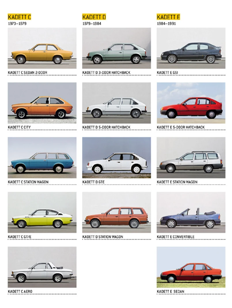Kadett D (1979-1984): rewolucja pod maską - po raz pierwszy w Kadecie zastosowano napęd na przednie koła, 1.3-litrowy silnik z górnym wałem rozrządu rozpoczął swoją karierę, a na rynek wprowadzono również silnik wysokoprężny (1.6 litra, 54 KM). Choć w ofercie nie znalazły się wersje coupé i cabrio, to wprowadzono po raz pierwszy vana. W sumie wyprodukowano 2,1 mln egzemplarzy.