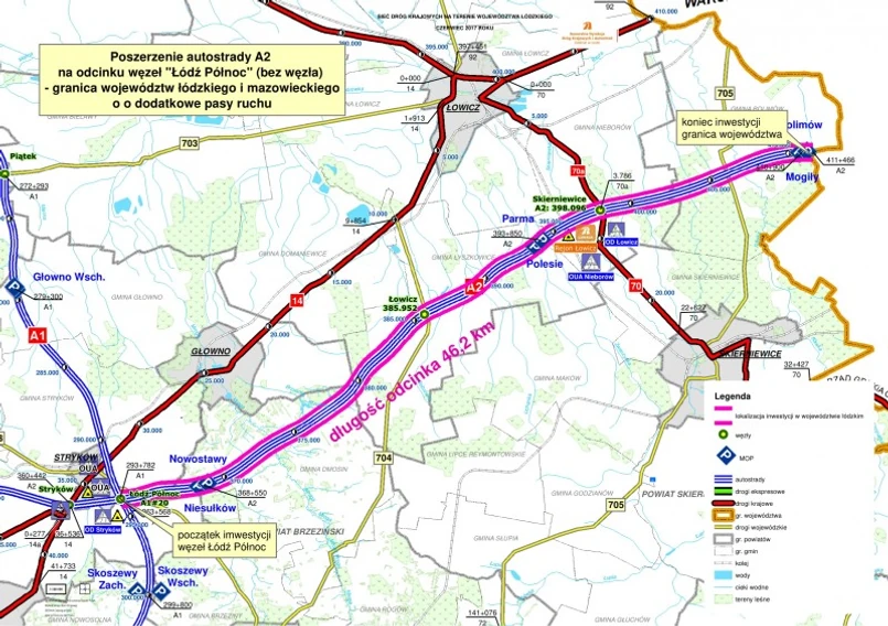 Autostrada A2 między Łodzią a Warszawą, na długości ok. 89 km, zyska dodatkowy pas ruchu na obu jezdniach. Docelowo trasa będzie miała od węzła Konotopa do węzła Pruszków po cztery pasy ruchu na obu jezdniach, natomiast dalszy odcinek do węzła Łódź Północ po trzy pasy w obu kierunkach. Dla odcinka od granicy woj. łódzkiego i mazowieckiego do węzła Konotopa wkrótce zostanie wydana decyzja o środowiskowych uwarunkowaniach.
