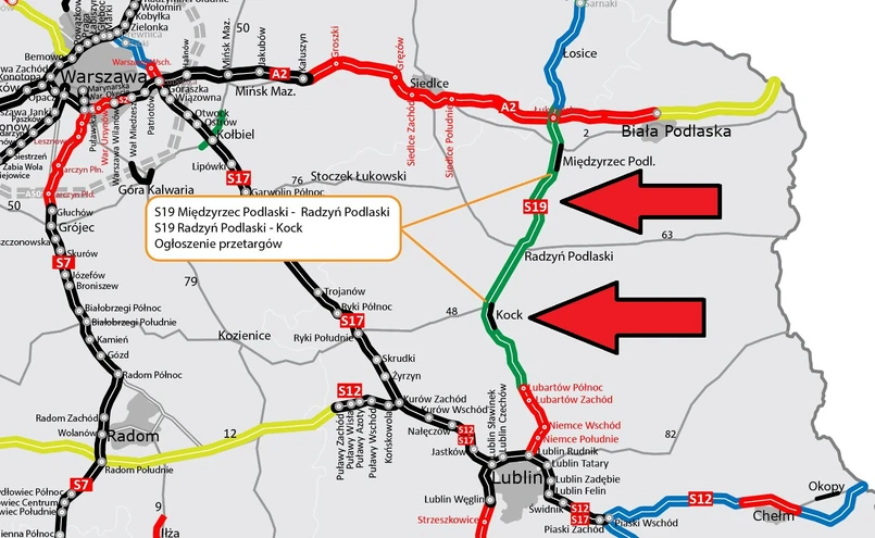 Via Carpatia zyska nowe odcinku drogi ekspresowej S19. Generalna Dyrekcja Dróg Krajowych i Autostrad ogłosiła przetarg na zaprojektowanie i budowę dwóch fragmentów trasy w województwie lubelskim: Międzyrzec Podlaski - Radzyń Podlaski oraz Radzyń Podlaski – Kock. Dzięki tej inwestycji powstaną dwa odcinki dwujezdniowej drogi ekspresowej, od końca obwodnicy Międzyrzeca Podlaskiego do początku obwodnicy Kocka, z dwoma pasami ruchu w obu kierunkach.