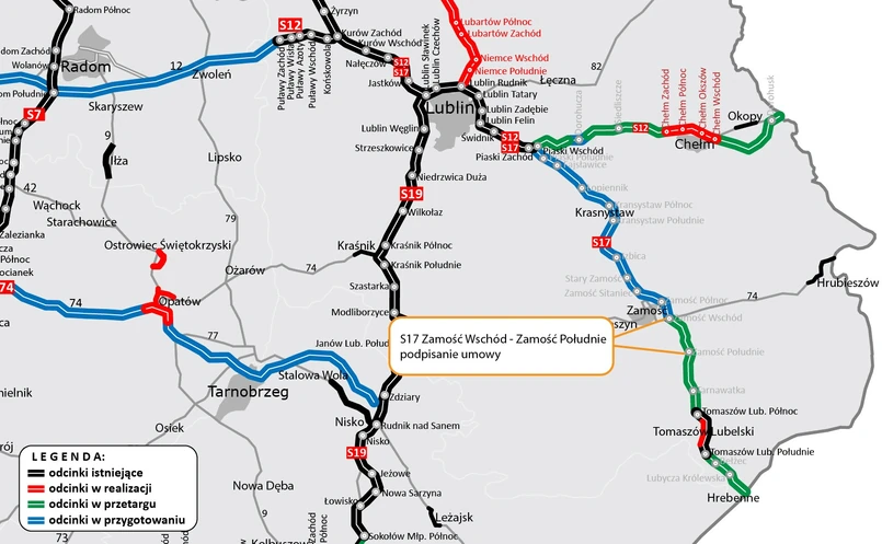GDDKiA informuje, że na etapie prac przygotowawczych jest również pięć odcinków drogi ekspresowej S17 pomiędzy Piaskami a Zamościem o łącznej długości ok. 67 km. W tym roku planowane jest ogłoszenie przetargów na realizację trzech z nich. W przypadku dwóch odcinków: Łopiennik – Krasnystaw oraz Zamość Sitaniec – Zamość Wschód, toczy się jeszcze procedura uzyskania decyzji środowiskowej.