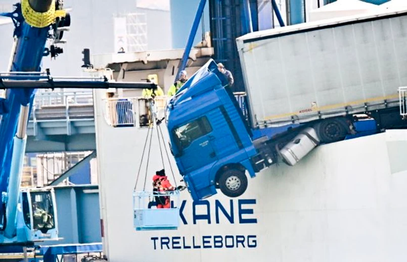 W porcie w Trelleborgu trwa akcja wyciągnięcia ciężarówki. Kolejny rejs promu do niemieckiego Rostocku jest opóźniony.