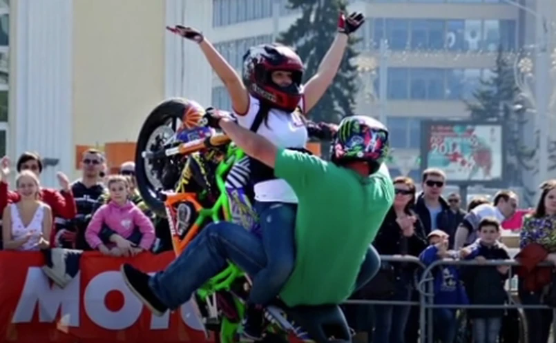 Pan młody przesiadł się na motocykl i zaczął wykonywać akrobacje wokół swojej wybranki. Jeżdżąc na tylnym kole okrążył ją wielokrotnie. W pobliżu inni kierowcy "palili gumę". Skrzyżowanie zasnuwał dym z opon.