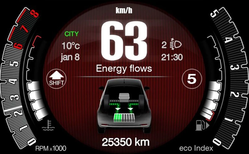 Dzięki tej technologii, silnik spalinowy wyłącza się nawetprzy prędkościach poniżej 30 km/h, poprzez prostą zmianę biegu na neutralny (wskaźnik na desce rozdzielczej, który wyświetla informacje o układzie hybrydowym, podpowiada kierowcy, kiedy to zrobić). W tym trybie akumulator litowy zasila wszystkie funkcje, zapewniając pełną kontrolę nad autem.