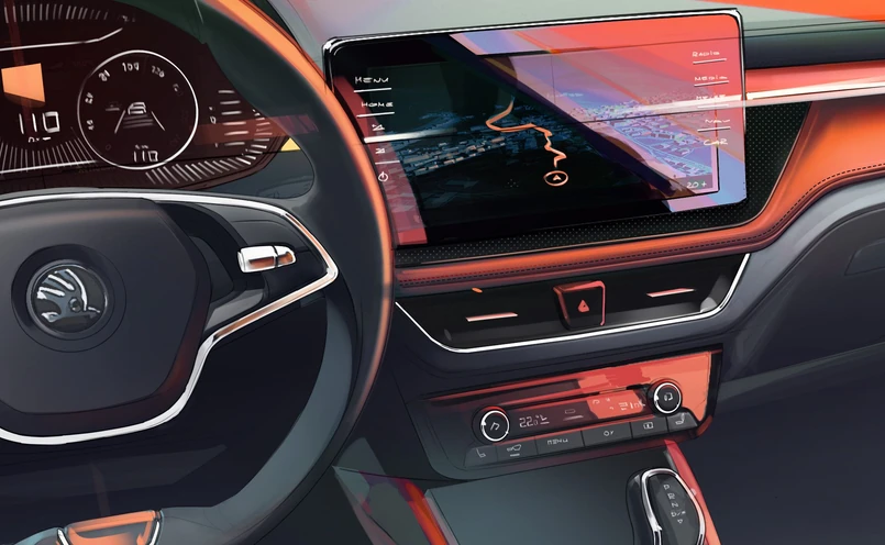 Skoda Fabia nowej, czwartej już generacji pierwszy raz zaprasza do wnętrza. Czesi pochwalili się właśnie szkicem kokpitu. Na pokładzie zawitała cyfryzacja. Symetrycznie zaprojektowana deska rozdzielcza z ozdobnymi elementami została podzielona na dwa poziomy. Górny z wirtualnym kokpitem zamiast analogowych zegarów oraz wielkim dotykowym ekranem na środku pełni funkcję informacyjno-rozrywkową. Dolna część odpowiada za obsługę klimatyzacji i pozwala bezprzewodowo zintegrować telefony z pokładowym systemem multimedialnym; przewidziano też ładowanie indukcyjne. Duże okrągłe kratki nawiewu po prawej i lewej stronie to nowe rozwiązanie – trzeba przyznać, że wyglądają fenomenalnie. Do tego mięsista dwuramienna kierownica niczym z luksusowych modeli Laurin&Klement. Fabia dostanie też nowe logo modelu z dwukolorowymi literami.
