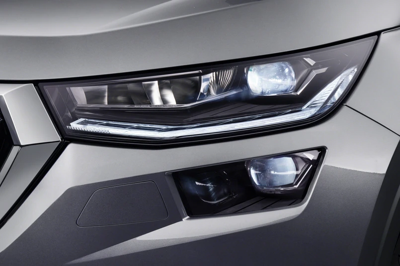 Kodiaq po metamorfozie dostał bardziej pionową, sześciokątną osłonę chłodnicy złożoną z podwójnych, pogrubionych żeber. Maska po bokach zyskała mocniejsze przetłoczenia. Nowe spojrzenie to węższe niż u poprzednika reflektory LED, które komponują się z lampami przeciwmgielnymi poniżej. Razem tworzą zespół czterech świateł. Po raz pierwszy Kodiaq może być wyposażony w reflektory LED Top Matrix - wówczas oba moduły LED, jeden nad drugim, świecą na stałe w trybie jazdy. Technologia ta pozwala zawsze mieć włączone światła drogowe bez oślepiania innych. Kamera na przedniej szybie wykrywa pojazdy, pieszych i przedmioty odbijające światło, a komputer automatycznie wyłącza poszczególne segmenty wiązki. Rozwiązanie zapewnia różne tryby oświetlenia w mieście, na autostradzie, w deszczu lub we mgle. Z kolei tylne lampy w kształcie wyostrzonego C są teraz wysmuklone i zdaniem projektantów stanowią lustrzane odbicie przednich.