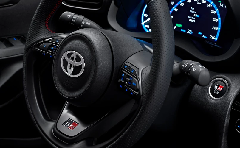 W środku czeka sportowy wystrój z czarną podsufitką plus głęboko profilowane i podgrzewane fotele pokryte tapicerką z ekologicznego zamszu Ultrasuede w kolorach zespołu Toyota Gazoo Racing. Specjalnie do tej wersji kierownicę obszyto perforowaną skórą. Przeszycia czerwoną nicią są także przy lewarku zmiany biegów. Do tego dochodzą aluminiowe nakładki na pedały i nakładki progowe, oznaczenia GR Sport, przycisk Start z logo GR, a także animacja ekranu z akcentami GR.