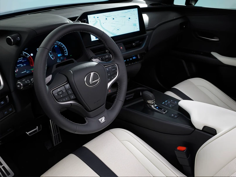 Od progu powiew świeżości. We wnętrzu UX 300h debiutują cyfrowe zegary o przekątnej 12,3 cala - takich próżno szukać w większych modelach NX i RX, a ich układ zmienia się w zależności od wybranego trybu jazdy. Wyświetlamy układ kokpitu można skomponować pod siebie. 8-calowy wyświetlacz stacji multimedialnej także jest nowy. Elektryczny przełącznik skrzyni biegów zastąpił mechaniczny lewarek. Panel sterowania szybami zyskał eleganckie wykończenie. Wreszcie z poziomu lepszej aplikacji na smartfona można ustawić np. temperaturę, rozmrażanie szyb, ogrzewanie foteli i kierownicy.