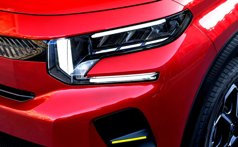 Wnętrze popisuje się prostotą i przestronnością. Nowy e-C3 przy wysokości 1,57 m zapewnia pasażerom siedzącym z przodu o 30 mm więcej miejsca nad głową, co przekłada się na wyższą pozycję za kierownicą i lepszą widoczność przy manewrowaniu. Do tego 163 mm prześwitu (wobec 135 mm w poprzedniku) pozwali bez stresu przebijać się przez wyboje, krawężniki czy progi zwalniające.