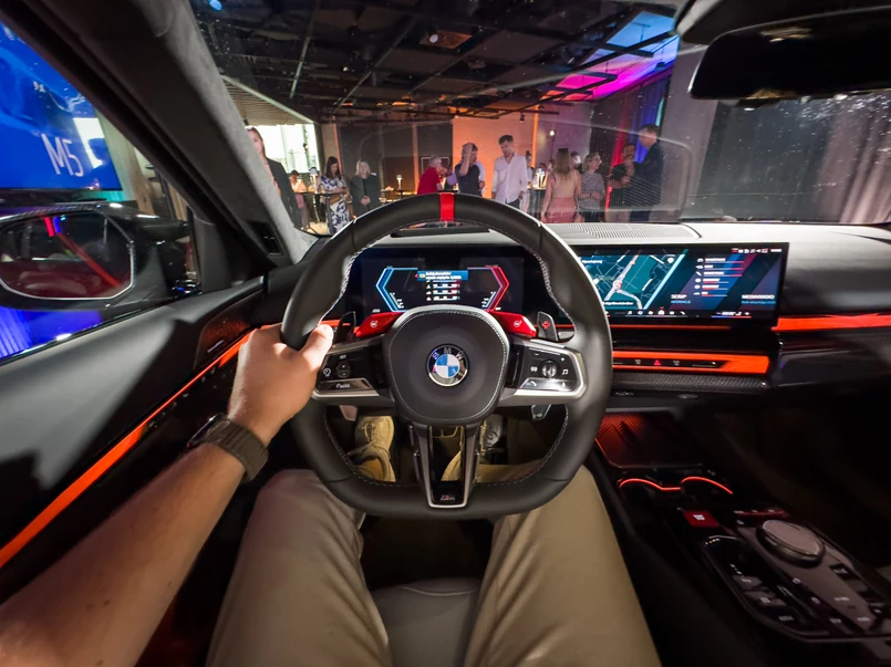 W kokpicie nowego M5 czeka na nas "samo tłuste". Gruba, mięsista kierownica z przyciskami M1 i M2, które pozwalają zapisać indywidualne ustawienia napędu i systemów, obszerne, wygodne i obszyte miękką skórą Merino fotele, które doskonale podpierają ciało, sporo wykończeń z włókna węglowego i wielki ekran w centralnym miejscu deski rozdzielczej. To z jego poziomu można dokładnie ustawiać sposób pracy podzespołów i zmieniać właściwości auta, które zgodnie z zapewnieniami producenta, ma oferować różne oblicza - od rasowego torowego potwora, po wciąż szybkie, ale wygodne auto do odbierania dzieciaków ze szkoły. Na tych, którzy zdecydują się ruszyć swoim M5 na tor, czeka możliwość całkowitego odłączenia kontroli trakcji, M Laptimer oraz funkcja Boost Control zapewniająca maksymalną dynamikę podczas sprintów i wyprzedzania.