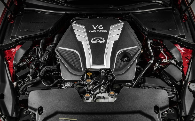 3 Wreszcie największa nowość w Q50. Model na 2016 rok będzie oferowany z nowym, trzylitrowym, podwójnie doładowanym silnikiem benzynowym V6. Na rynki europejskie przewidziano silniejszą 405-konną odmianę (475 Nm). Z kolei słabsza wersja (oferowana choćby na rynki Bliskiego Wschodu) generuje 304 KM ( 400 Nm). Infiniti Q50 Sport 2016, w wersji z trzylitrowym silnikiem twin-turbo, po raz pierwszy wzbogacono o sterowane elektronicznie zawieszenie dynamiczne.