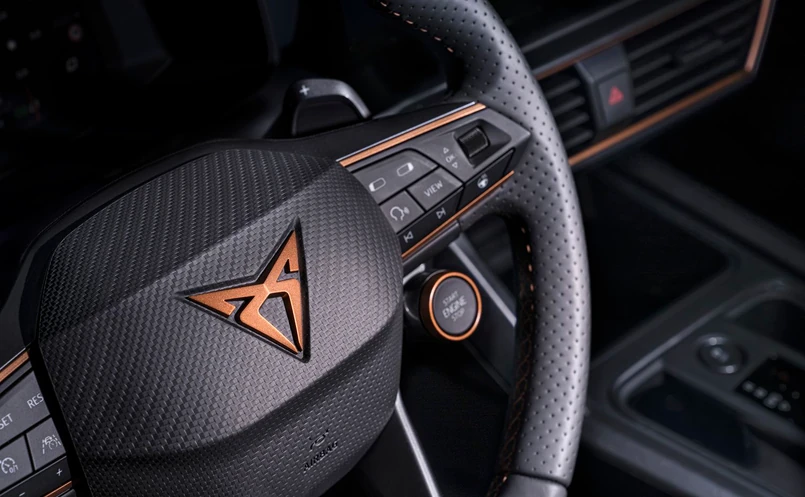 Kierowcy z pewnością docenią kokpit z wirtualnymi zegarami (przekątna 10,25 cala) czy dotykowy 12-calowy ekran stacji multimedialnej z obrazem ostrym jak brzytwa i nawigacją. Formentor VZ to także trzystrefowa klimatyzacja automatyczna, adaptacyjne zawieszenie DCC, kluczyk zbliżeniowy, podgrzewanie foteli (kubełkowych) i kierownicy, reflektory LED oraz ambientowe oświetlenie kabiny, przycisk trybu CUPRA. Do tego są jeszcze podświetlane nakładki progowe w przednich drzwiach czy sportowe nakładki na pedały.