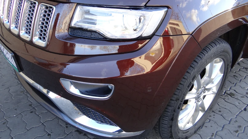 1 Nowy przód grand cherokee z charakterystycznym siedmiożebrowym chromowanym grilem przypomina kwadratową szczękę boksera, który na ułamek sekundy przed ciosem szczerzy się do rywala błyszczącym ochraniaczem na zęby. Wielki SUV patrzy na świat przez mniejsze reflektory z wbudowanymi diodami LED. Grand wygląda tak samo dobrze zaraz po wyjechaniu z myjni, jak i ubłocony po dach.
